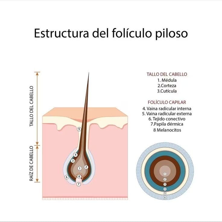 El pelo consta de dos partes: una libre o tallo y una no visible o raíz, misma que
